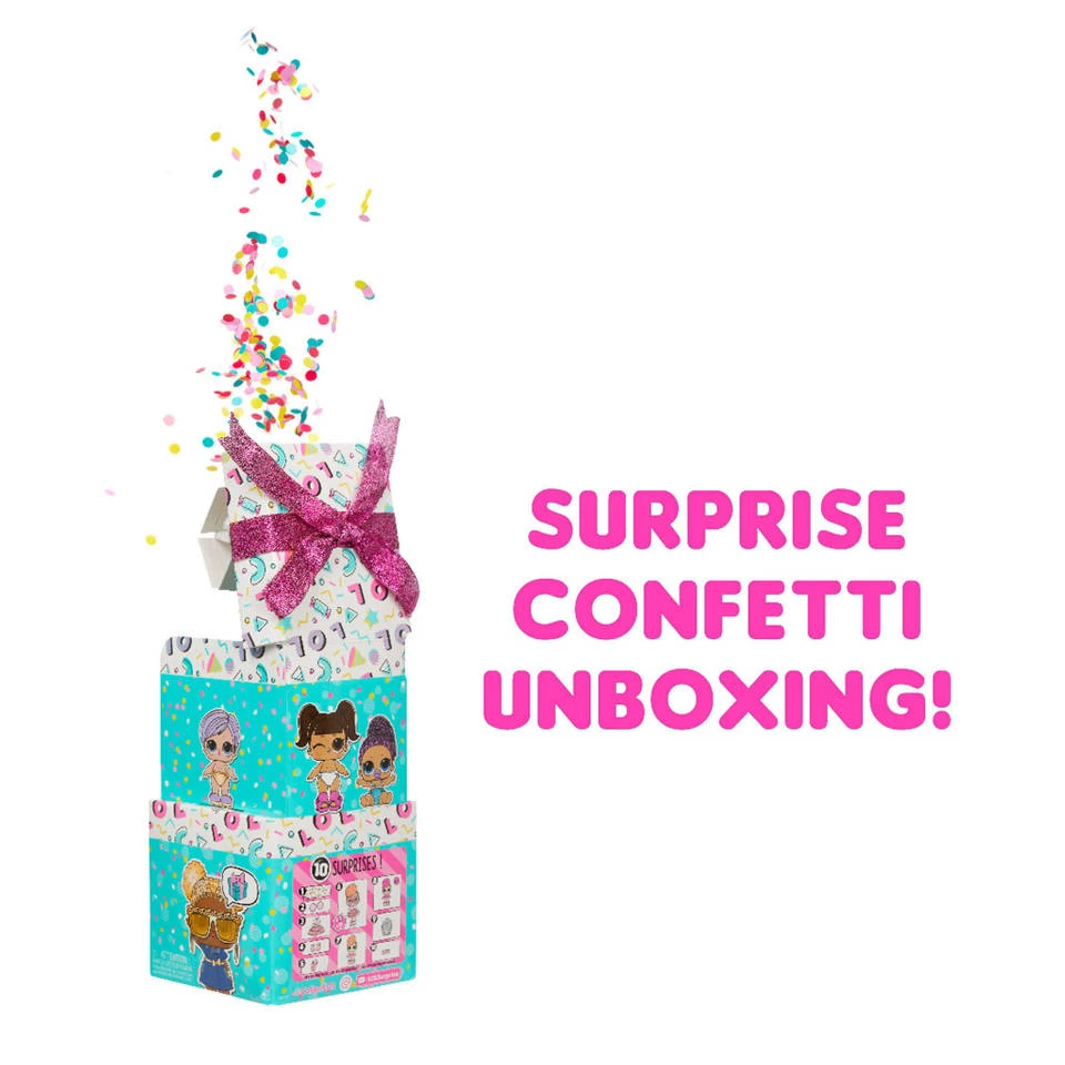 Deze L.O.L. Surprise! Confetti Birthday Sisters pop wordt geleverd met tien verrassingen, inclusief een uitpakervaring met confettiverrassing.