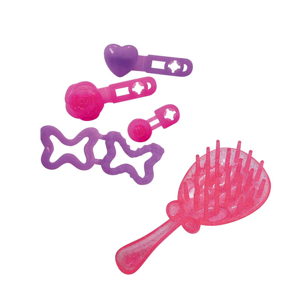 Pak snel de borstel in deze set en kam alle haren tot ze mooi glanzen en versier ze met een van de 4 haarclips. Als je op het glimmende hartje druk hoor je haar goedkeurend hinniken en weg galopperen terwijl haar hoorn en zadel verschillende kleuren licht geven. Magisch mooi!