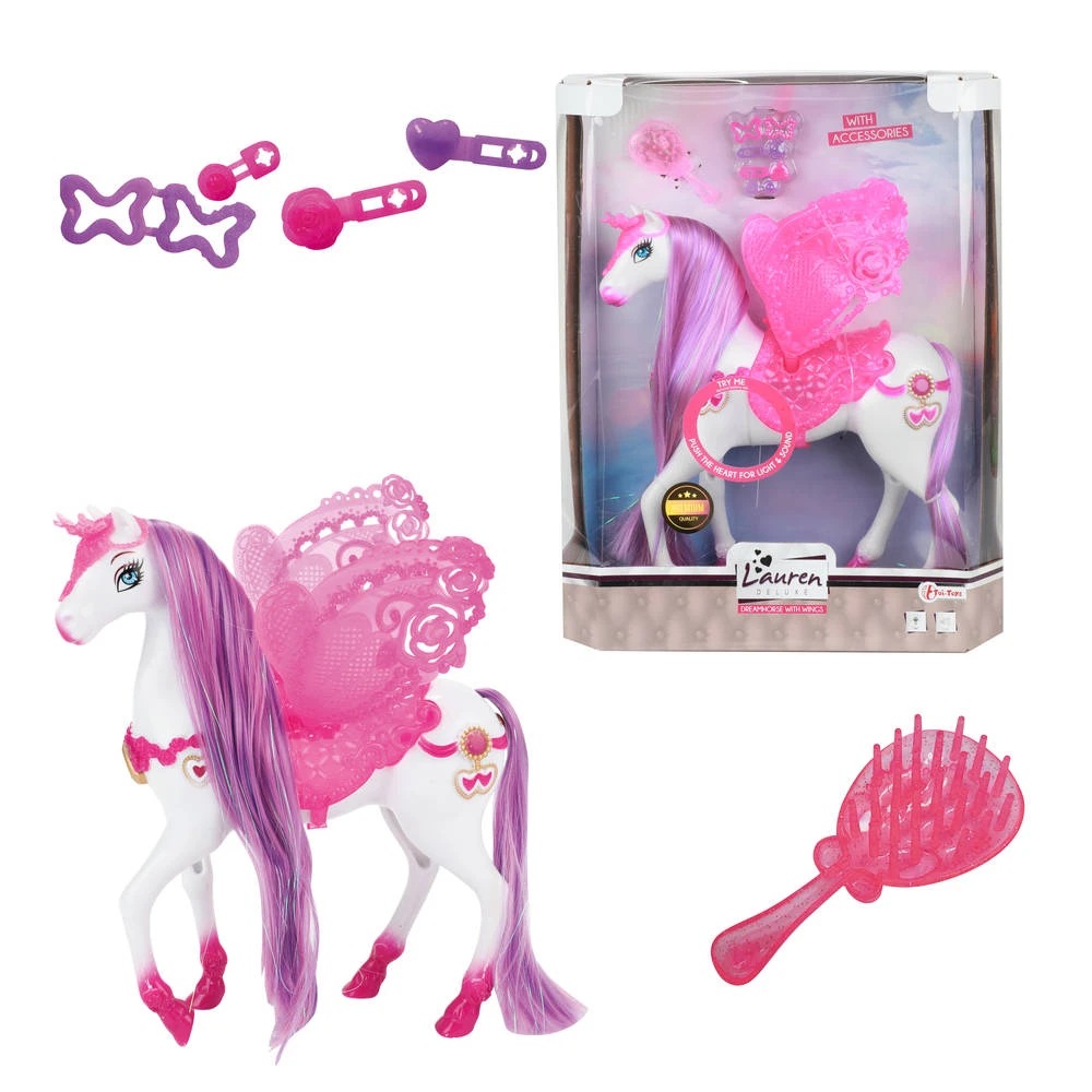 Vlieg weg met dit mooie Lauren paard met accessoires. Kam haar manen en gebruik de mooie haarclips. Het paard is uitgerust met leuke licht- en geluidseffecten.