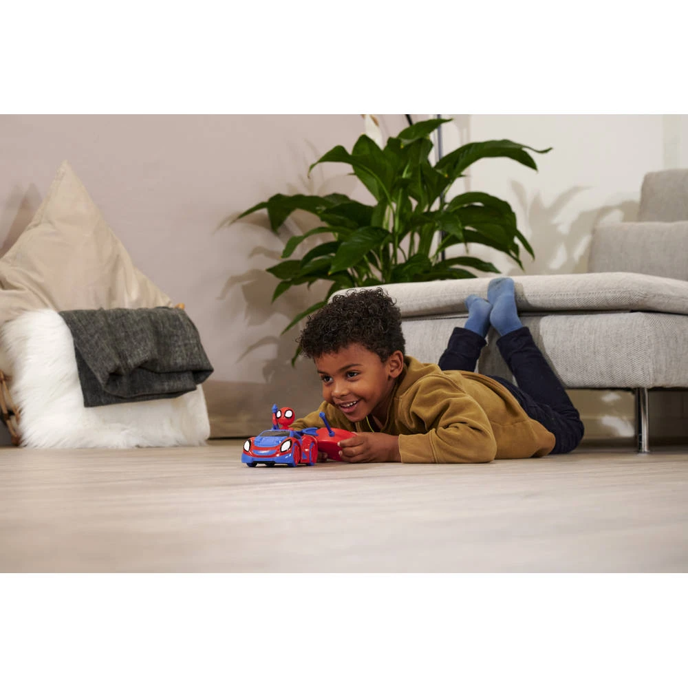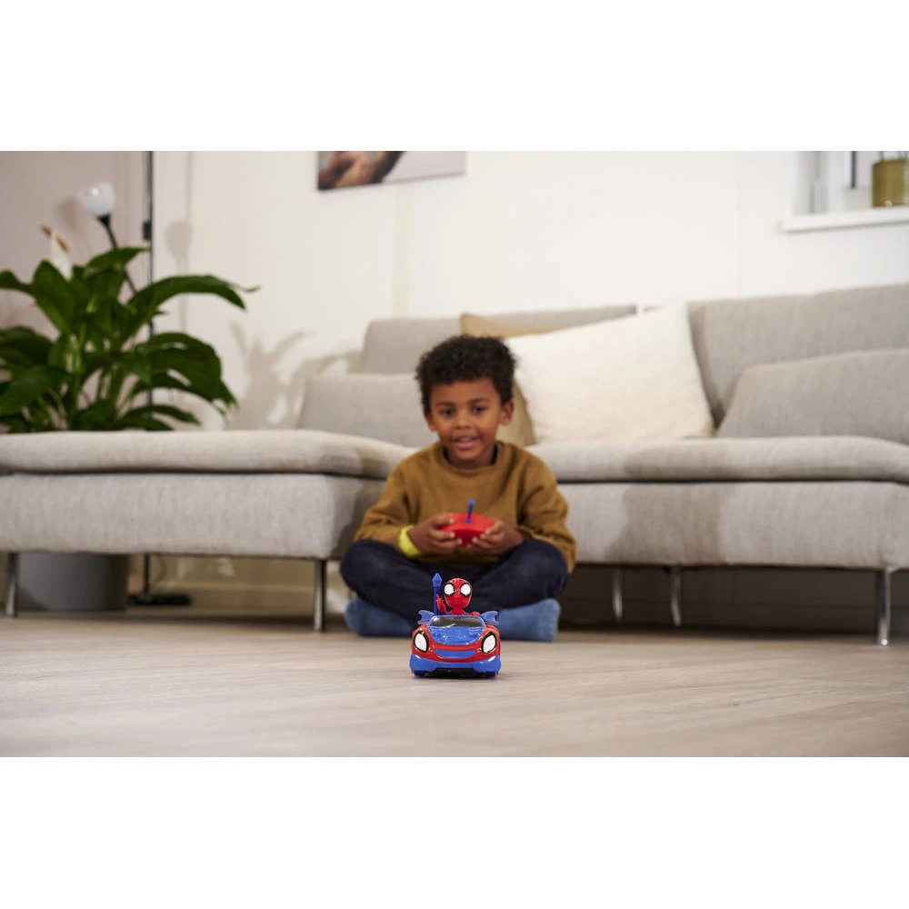 Met deze op afstand bestuurbare Spidey Web Crawler is Spider-Man zijn rivalen altijd een stap voor. Dit supersnelle voertuig kan dankzij de dubbelzijdige assen met een druk op de knop 360° draaien via het 2-kanaals radiografisch bedieningssysteem en onverwacht van richting veranderen – wie maakt een kans? De Spidey Web Crawler is gemaakt op een schaal van 1:24.