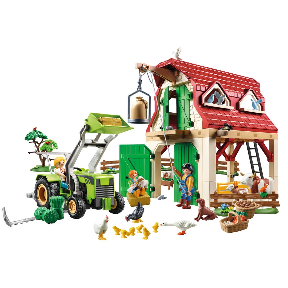 - De set bevat drie Playmobil-figuren, een boerderij met goederenlift, een tractor, koe en kalf, ganzen, kuikens, muizen, een hond en vele andere accessoires.