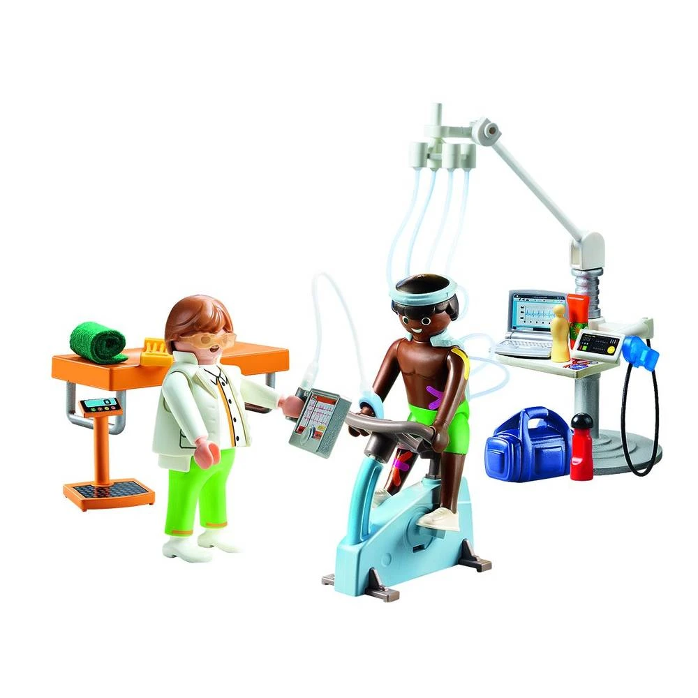 - De speelset bevat twee Playmobil speelfiguren, een hometrainer met ECG-aansluiting, een dokterstas, een behandelbank en vele andere medische accessoires.