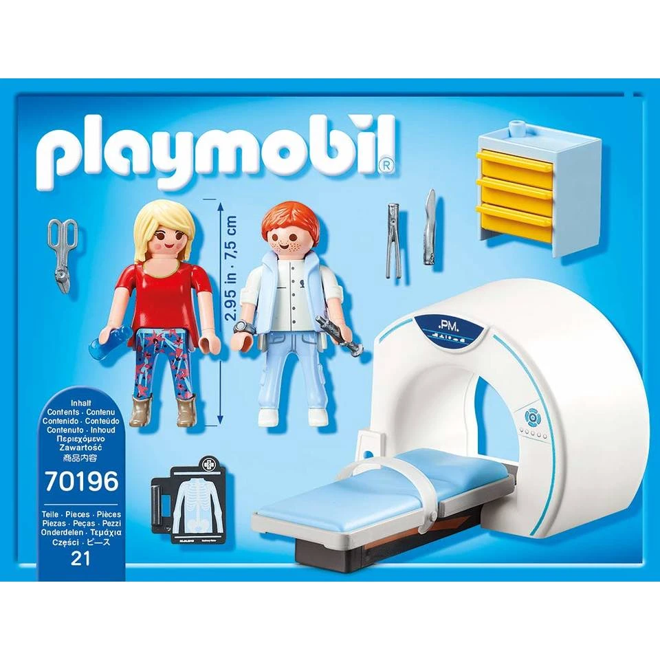 De radioloog gebruikt de MRI-machine in de Playmobil City Life radiologiekamer om de interne organen van zijn patiënten te onderzoeken. Vandaag is Elizabeth aanwezig om verschillende tests te ondergaan. Ze gaat op de bank liggen en wordt in de buis geschoven. Als ze tijdens het onderzoek hulp nodig heeft, kan ze met een druk op de knop de dokter bellen. Alles gaat sneller dan verwacht en ze wordt weer naar buiten geschoven. De arts komt de resultaten van het onderzoek bespreken: “Alles is in orde”!