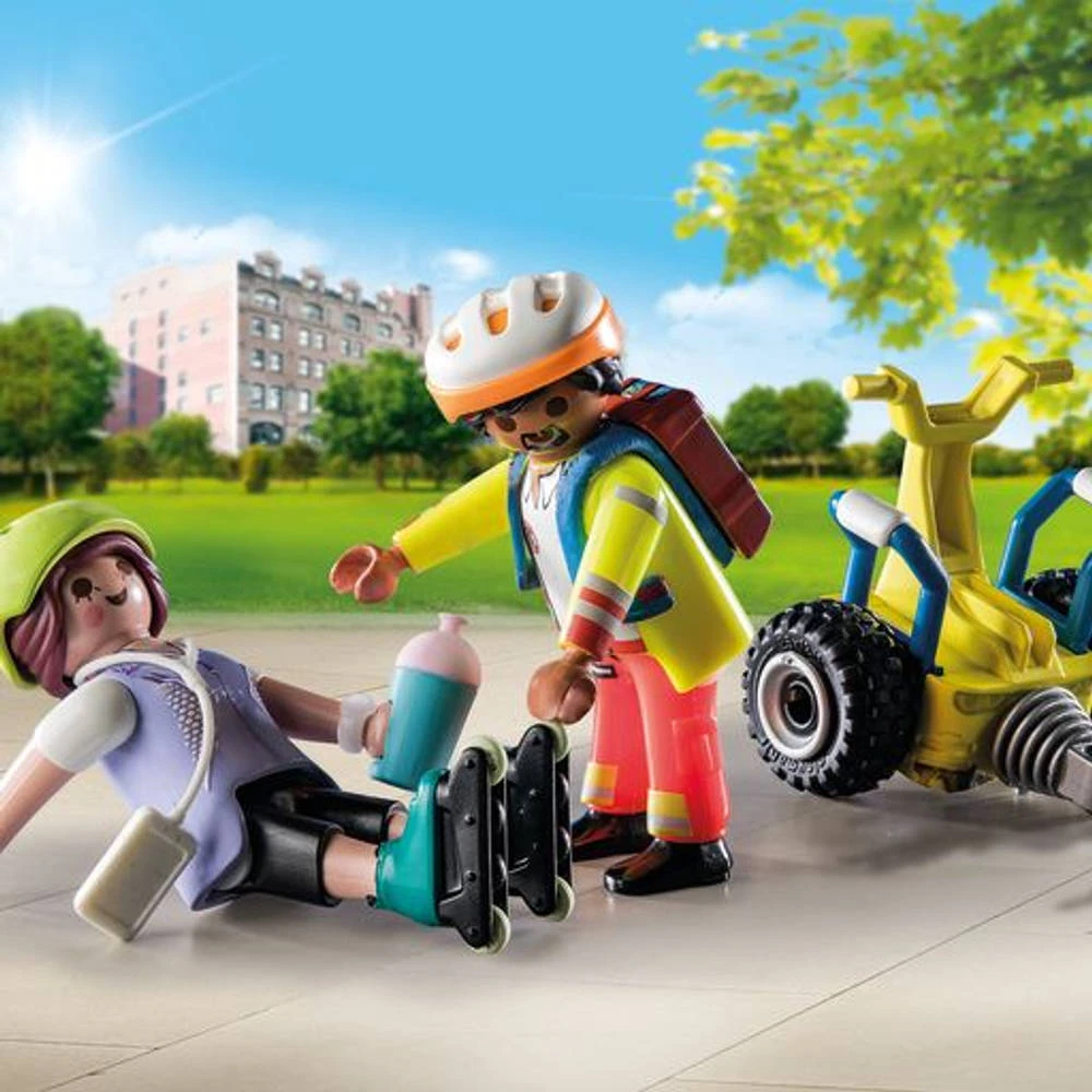 Schiet snel te hulp met de segway starterpack van Playmobil. Een inline skater is gevallen in het park en kan niet meer opstaan. De behulpzame paramedicus schiet onmiddellijk te hulp. Dankzij zijn behendige segway is hij ook op smalle paadjes snel ter plaatse. Zodra hij bij de gewonde is, zorgt hij voor eerste hulp. Vervolgens gaat de skater naar het ziekenhuis voor verder onderzoek.