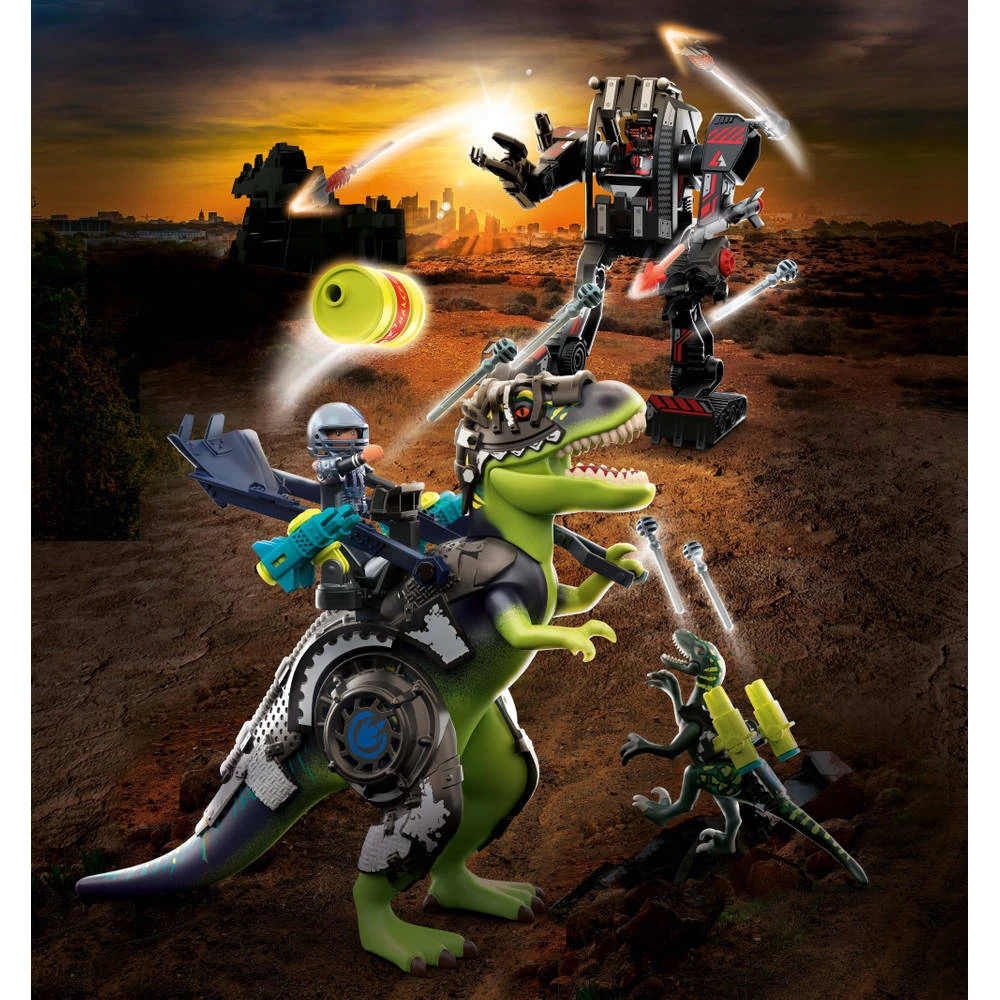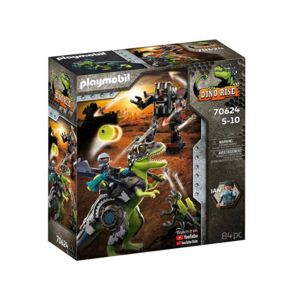 Speel de leukste dinoverhalen na met de Playmobil Dino Rise T-Rex! Waarschuwing, de T-Rex valt aan! De T-Rex? Oh nee, dit is een hypermoderne gevechtsrobot en degene die hem bestuurt, is iets slechts van plan. De robotachtige machine is op oorlogspad. Wie kan hem stoppen? De onverschrokken Ian blokkeert de weg van de machine en hij is niet alleen. Ian zit op de rug van een echte T-Rex met titaniumhard pantser, gewapend met kanonnen en een katapult. Samen met de dinosaurus en supergeavanceerde gevechtsuitrusting gaan de twee de strijd met de machine aan. De strijd der titanen begint!