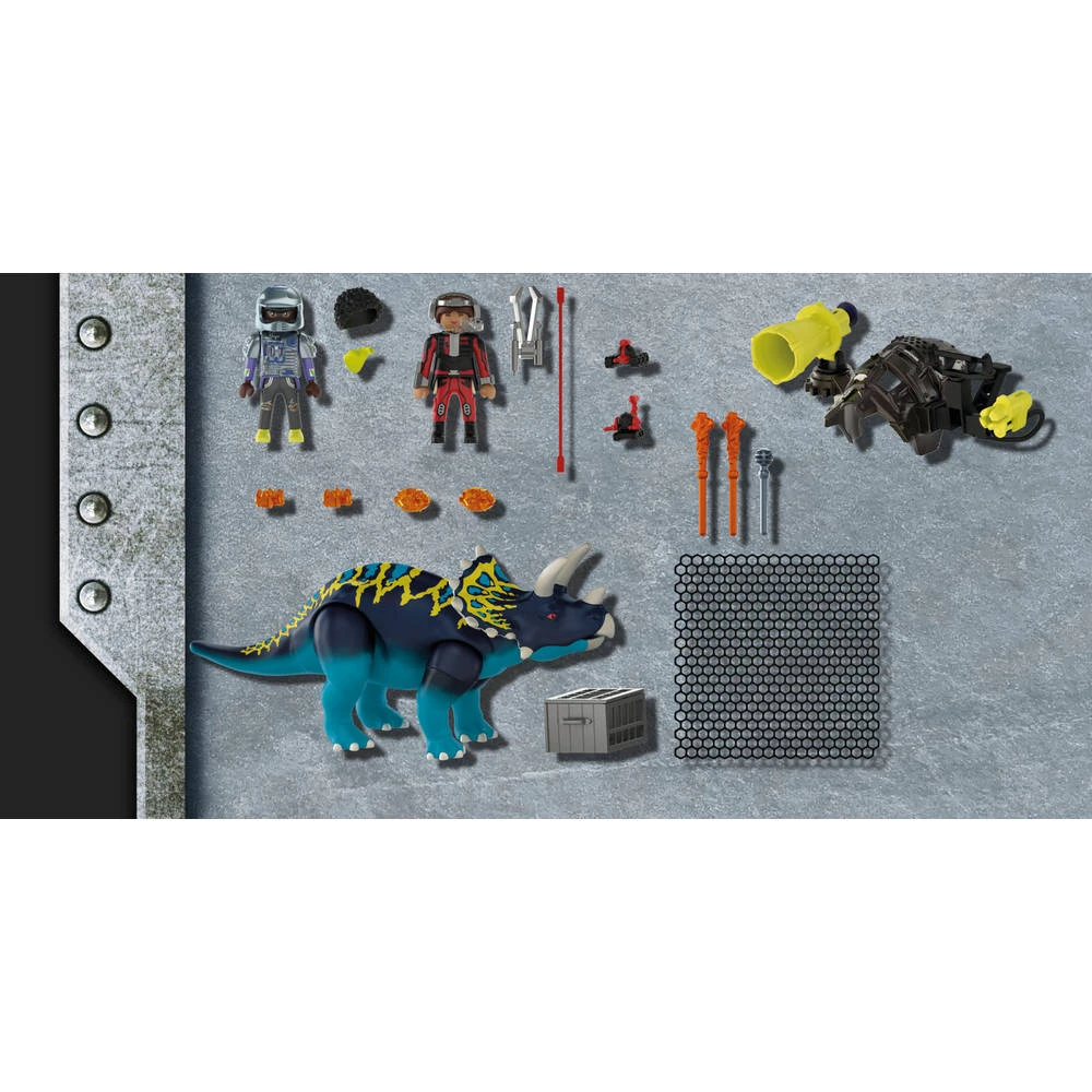 Met de Playmobil Dino Rise Triceratops maak je je collectie compleet. Soms is de vijand ook veel kleiner dan verwacht, bijvoorbeeld een minirobot. De vervelende kleine machines proberen ongemerkt de plannen van Uncle Rob en het Dino-team te ontdekken. Maar het Dino-team laat zich niet zo gemakkelijk in de kaart kijken. Om voorbereid te zijn op grote en kleine tegenstanders beschikt de gepantserde Triceratops niet alleen over een normaal kanon, maar ook over een vangnetkanon. Als zijn teamgenoot Jaden op het juiste moment het vangnet uitgooit worden ook de minirobots gevangen en daarmee onschadelijk gemaakt. Sterke dinosauruskracht voor lastige speciale missies.