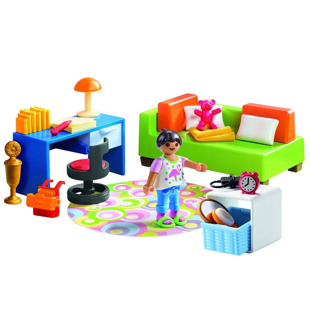 - De speelset bevat een Playmobil figuur, een slaapbank, een bureau met een klein notitieblokje met echt papier, een plankje, een stoel, een lamp en vele andere inrichtingselementen en een schooltas met boeken.
