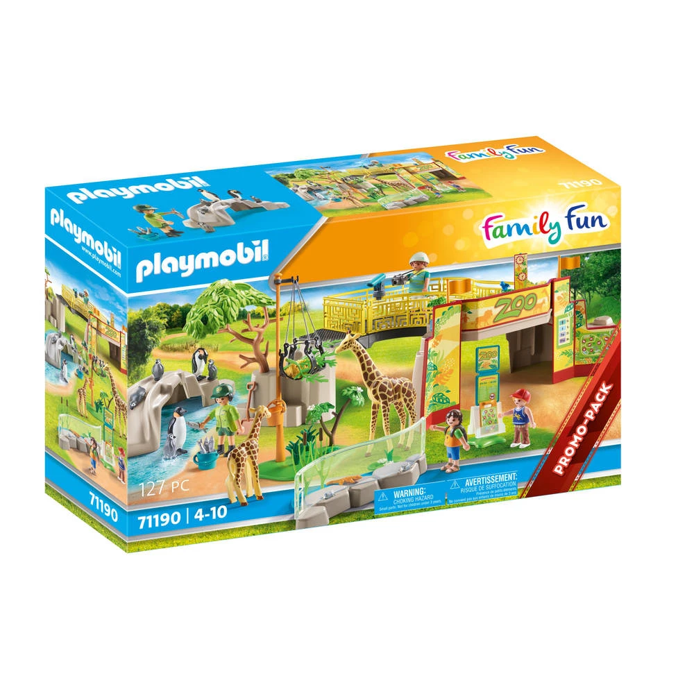 Loop de vrolijke avonturendierentuin van Playmobil binnen. Hier kunnen inheemse en exotische dieren van dichtbij worden geobserveerd. Een loopbrug boven het toegangsportaal leidt bezoekers naar een uitkijkplatform. Vanaf deze verhoogde positie kunnen pinguïns en giraffen op hun gemak worden bekeken in hun ruime verblijven. Het is voedertijd en de verzorger van de dierentuin voorziet de giraffen van voedsel en vers water. Dan pakt hij de schop en maakt het verblijf schoon. Ondertussen glijden de pinguïns in het aangrenzende verblijf vrolijk van de ijsglijbaan het water in.
