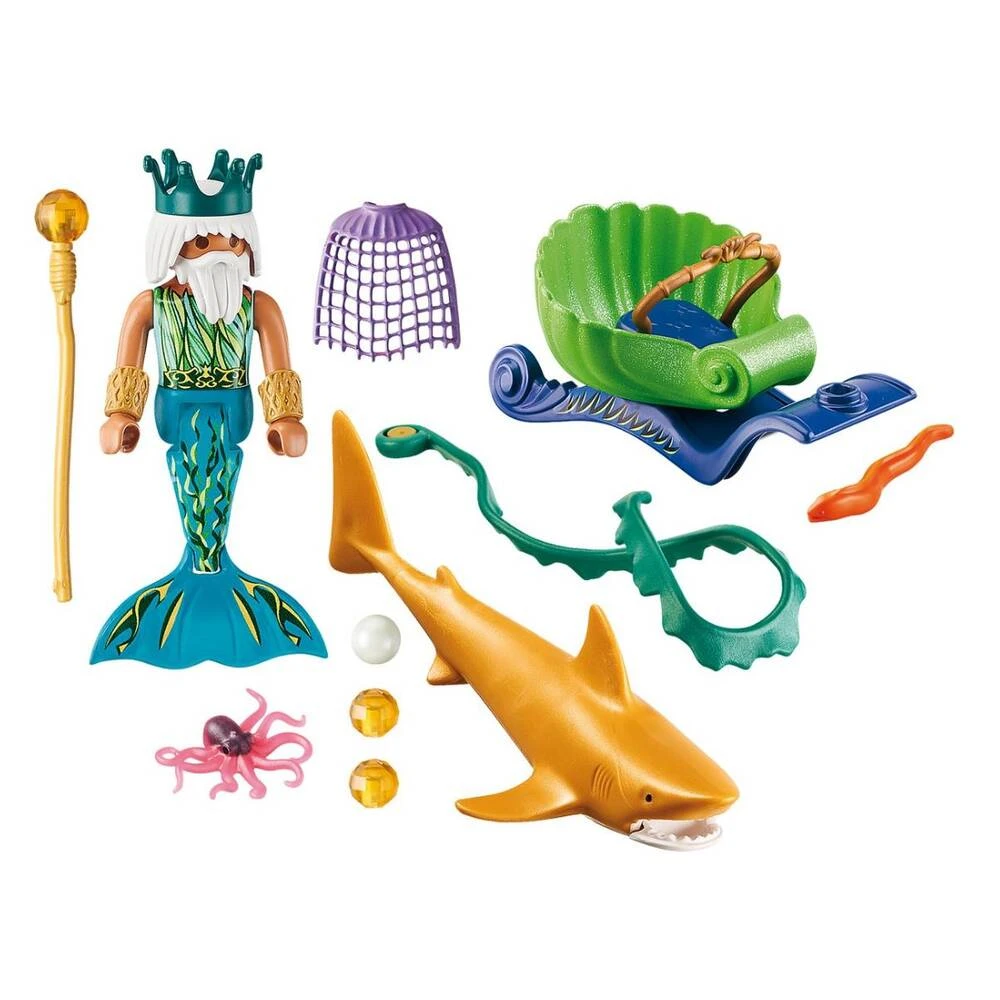 - De speelset bevat de zeekoning met kroon, een zeeschelpwagen, een haai, kralen en andere accessoires.