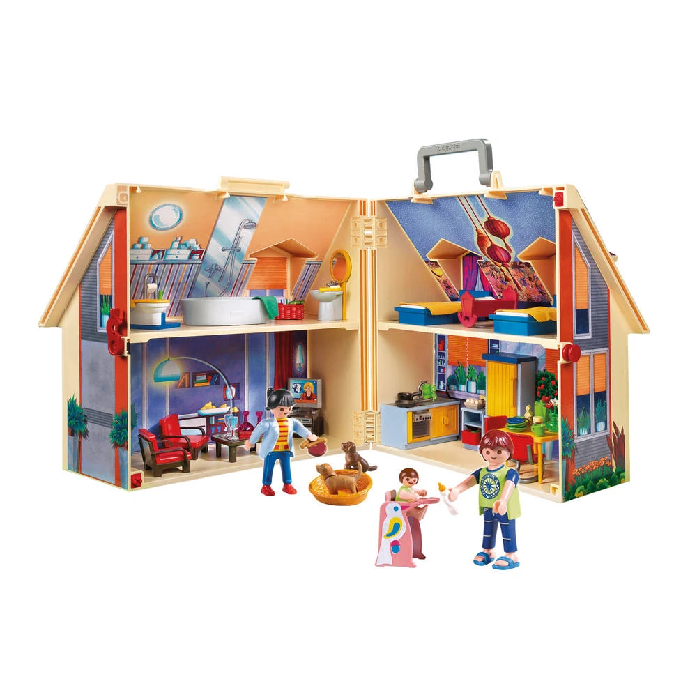 Wanneer je dit prachtige meeneem-poppenhuis openklapt vind je op alle verdiepingen volledig ingerichte kamers. Laat de familieleden zitten in de woonkamer of een maaltijd bereiden in de keuken. PLAYMOBIL-nr. 5167