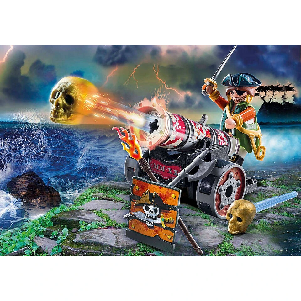 - Deze speelset bevat een kanon met doodskopkogel, een Playmobil piratenfiguur met hoed, sjerp en manchetten en nog meer accessoires.