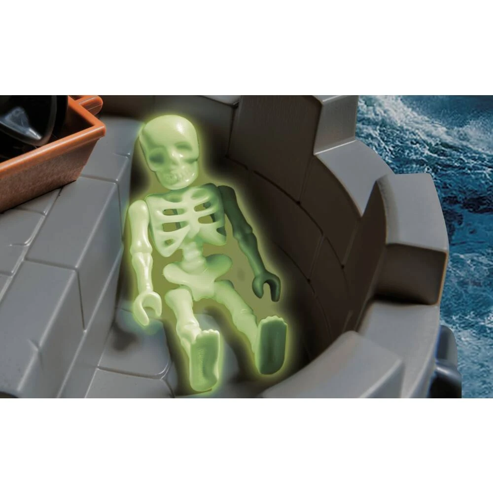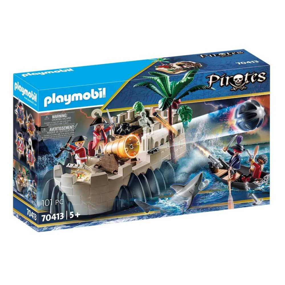De vesting van de Playmobil Pirates soldaten is uitgerust met groot kanon, kerker en schatkist. De set bevat twee Roodrokken en een skelet. PLAYMOBIL-nr. 70413