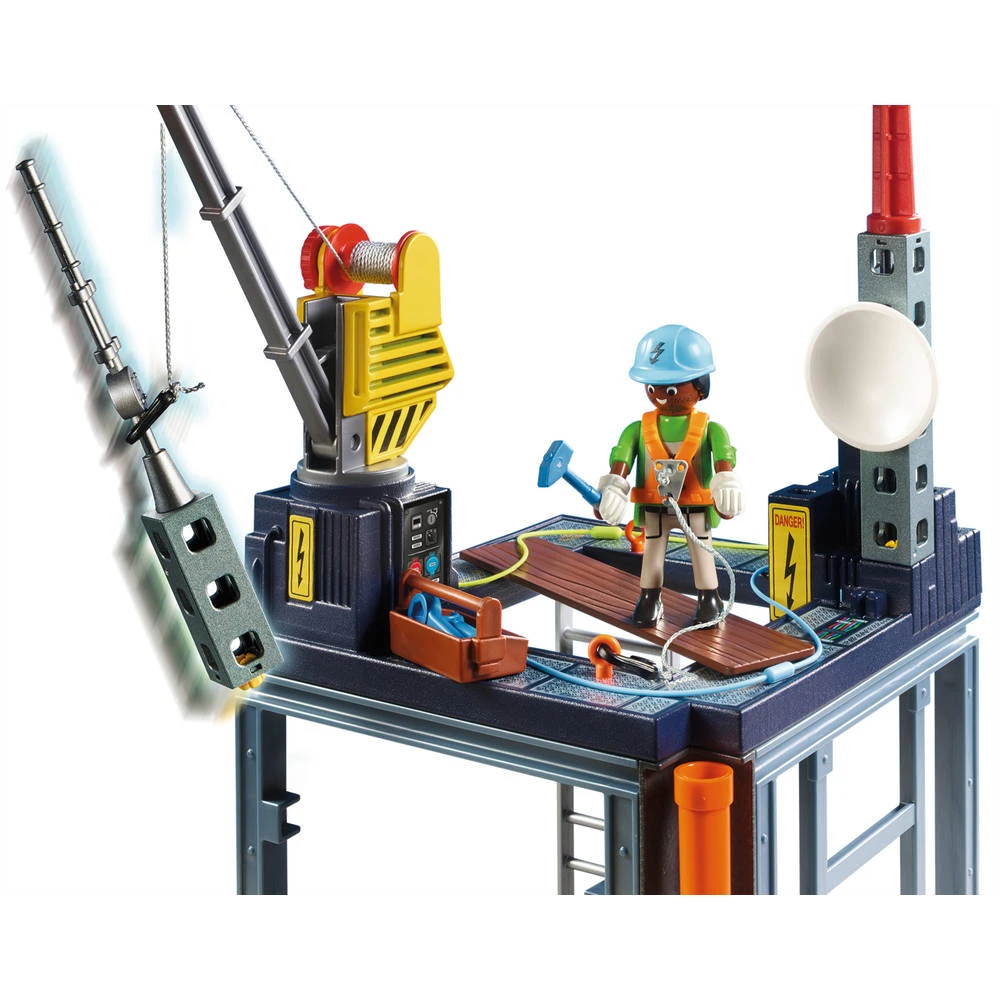 Op de Playmobil starterpack bouwplaats met lier is elke helpende hand nodig. De stalen legger staat gereed. De elektromonteur moet alleen nog de kabel op het dak leggen. Om zichzelf te beschermen tegen ongevallen draagt de monteur een helm en handschoenen en is hij vastgezet met een klimgordel. Zware voorwerpen tilt hij eenvoudig met de lier op het dak. De elektromonteur werkt tot in de avond. Combineer de bouwplaats met de huismodulesets die op elkaar gebouwd kunnen worden.