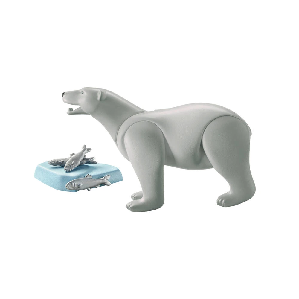 - De set bevat een ijsbeerfiguur, een sneeuwdek, vis en een dierenkenniskaart.
