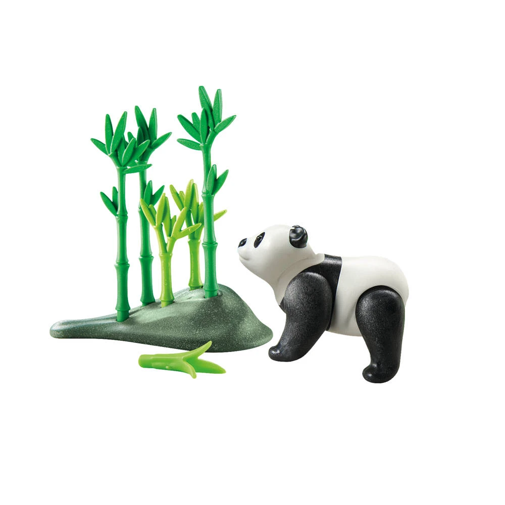 - De set bevat een panda, een bamboeplant, gras en een dierenkenniskaart.