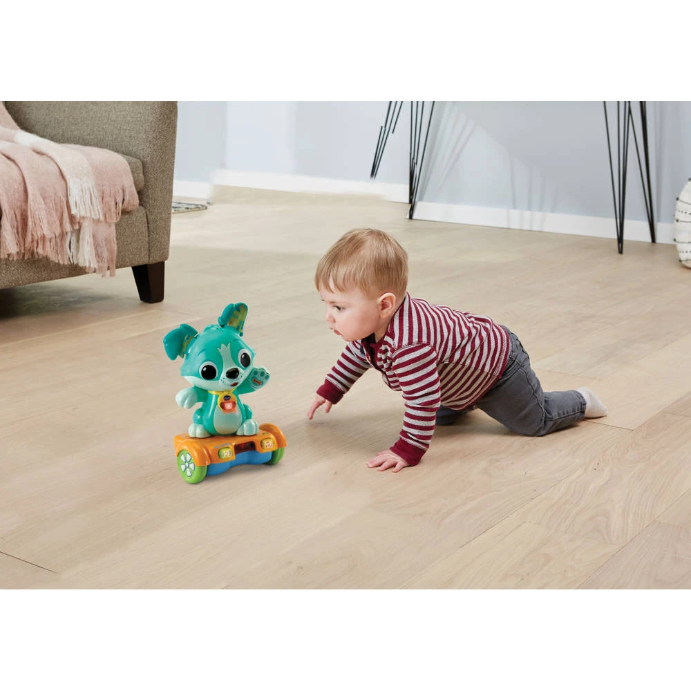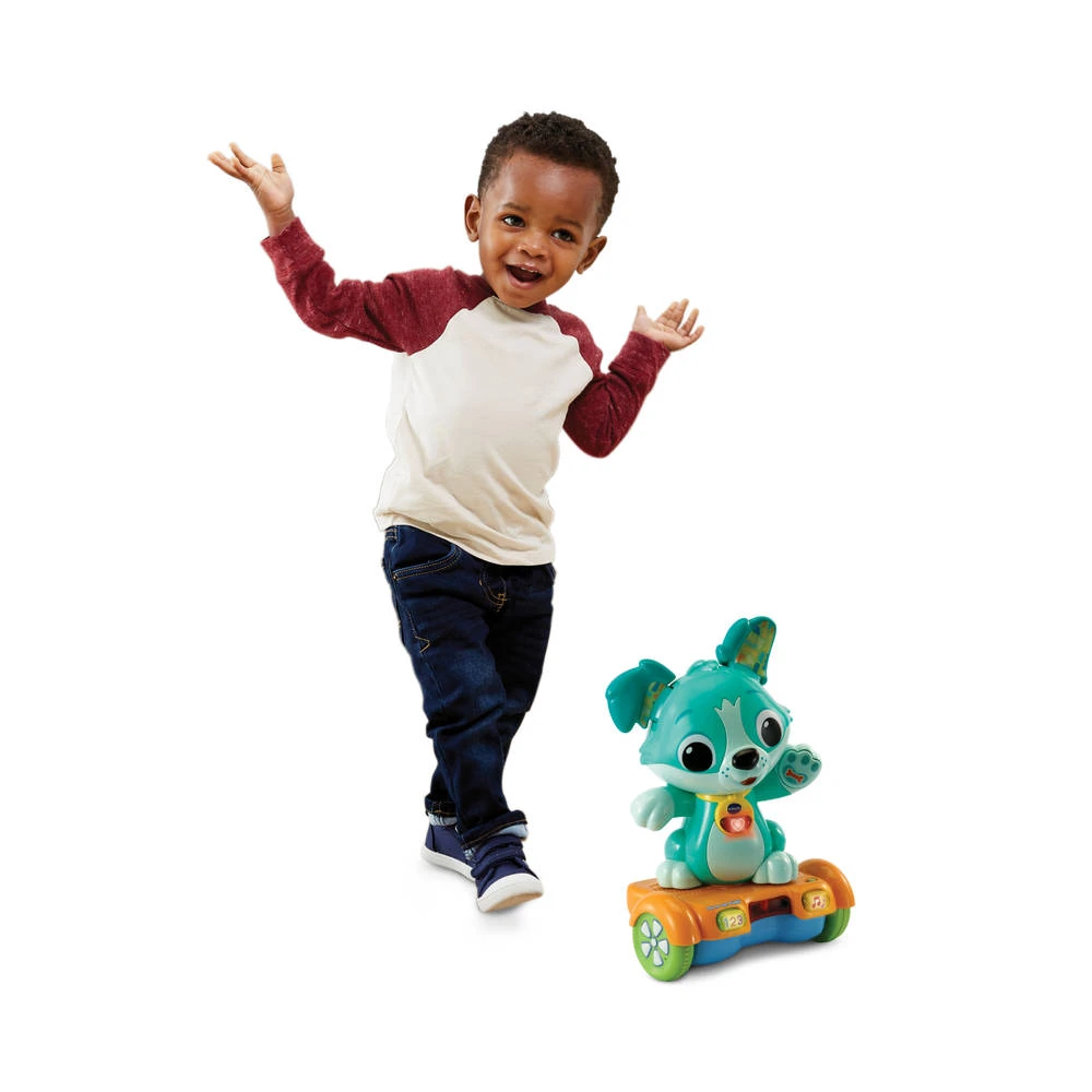 - Deze vrolijke puppy rijdt rond op zijn hoverboard en moedigt kleintjes aan om te dansen en een ‘pak me dan’-spelletje te spelen.